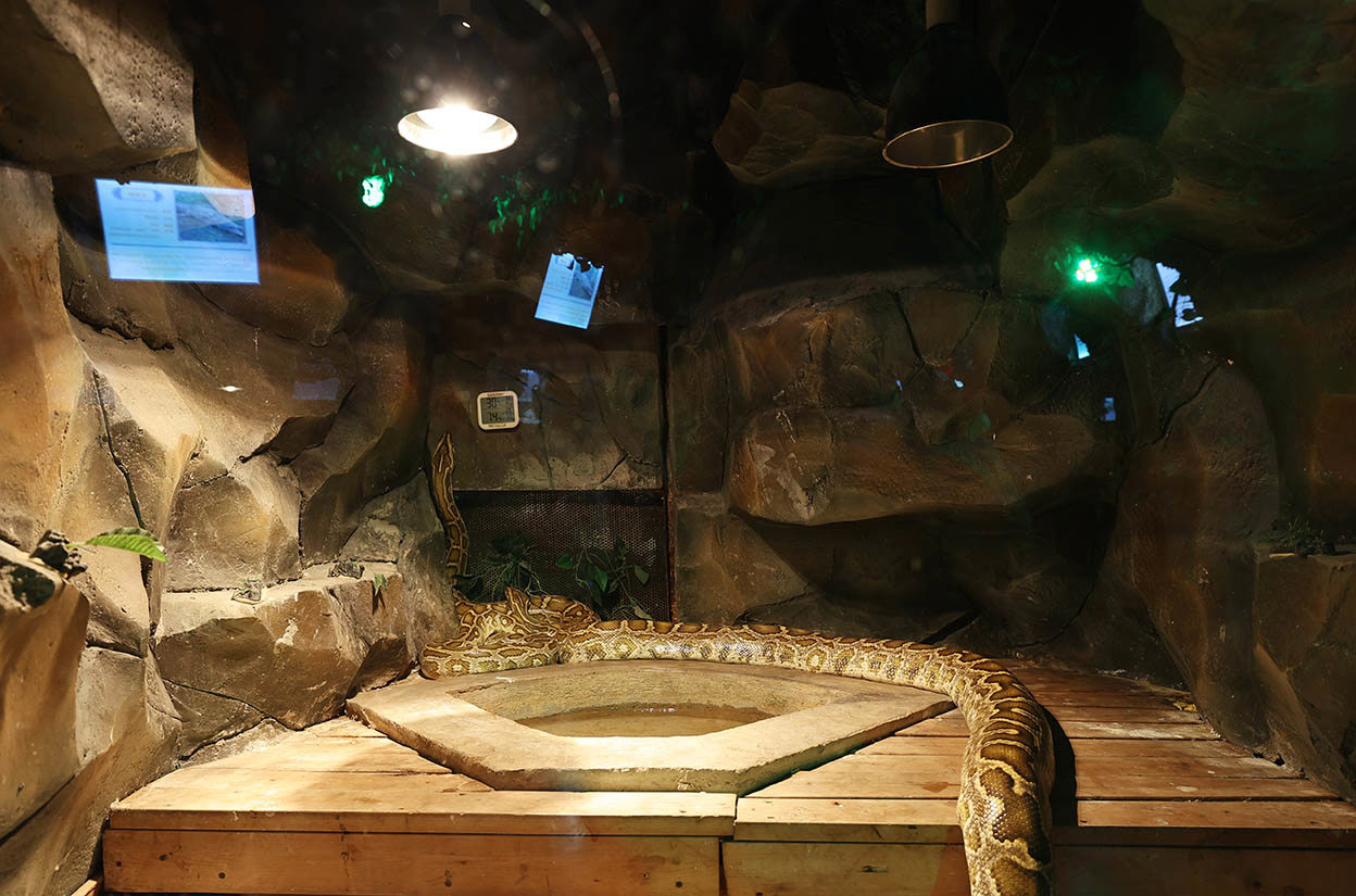 兩棲爬行類動物們也享受著各種保暖措施帶來的溫暖。一進館內(nèi),一股潮熱的空氣撲面而來。黃金蟒、網(wǎng)紋蟒、蜥蜴……它們居住的籠舍里,溫度計分別顯示為25℃。除了有地暖之外,還可以享受到浴霸帶來的溫暖。