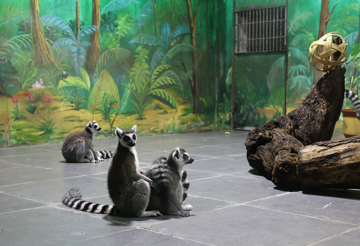 動物管理部猴苑班長李艷玲介紹,為了讓環(huán)尾狐猴生活得更加快樂,他們將室外的豐容設(shè)施搬到了室內(nèi),取食器、輪胎、竹子編制的小球等,最大限度地還原它們在室外的生存環(huán)境。除了環(huán)境豐容,冬天里,飼養(yǎng)員們也會制造一些食物豐容,比如將食物藏在葉子下面,讓動物們邊吃邊玩。