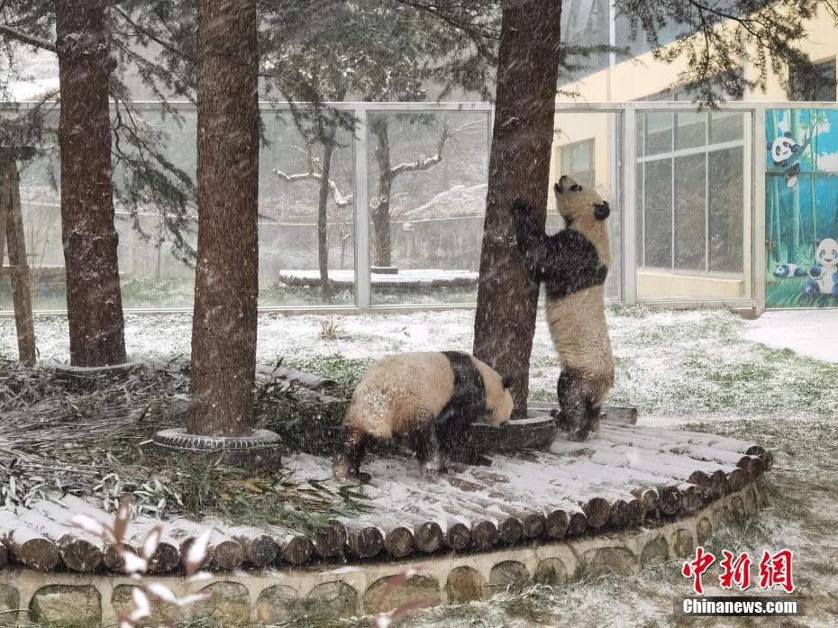 12月15日,西安迎來降雪天氣,在西安秦嶺野生動物園里,兩只憨態(tài)可掬的大熊貓來到戶外,在雪地里玩起了摔跤。時而互相追逐,時而摟抱在一起,玩得不亦樂乎。